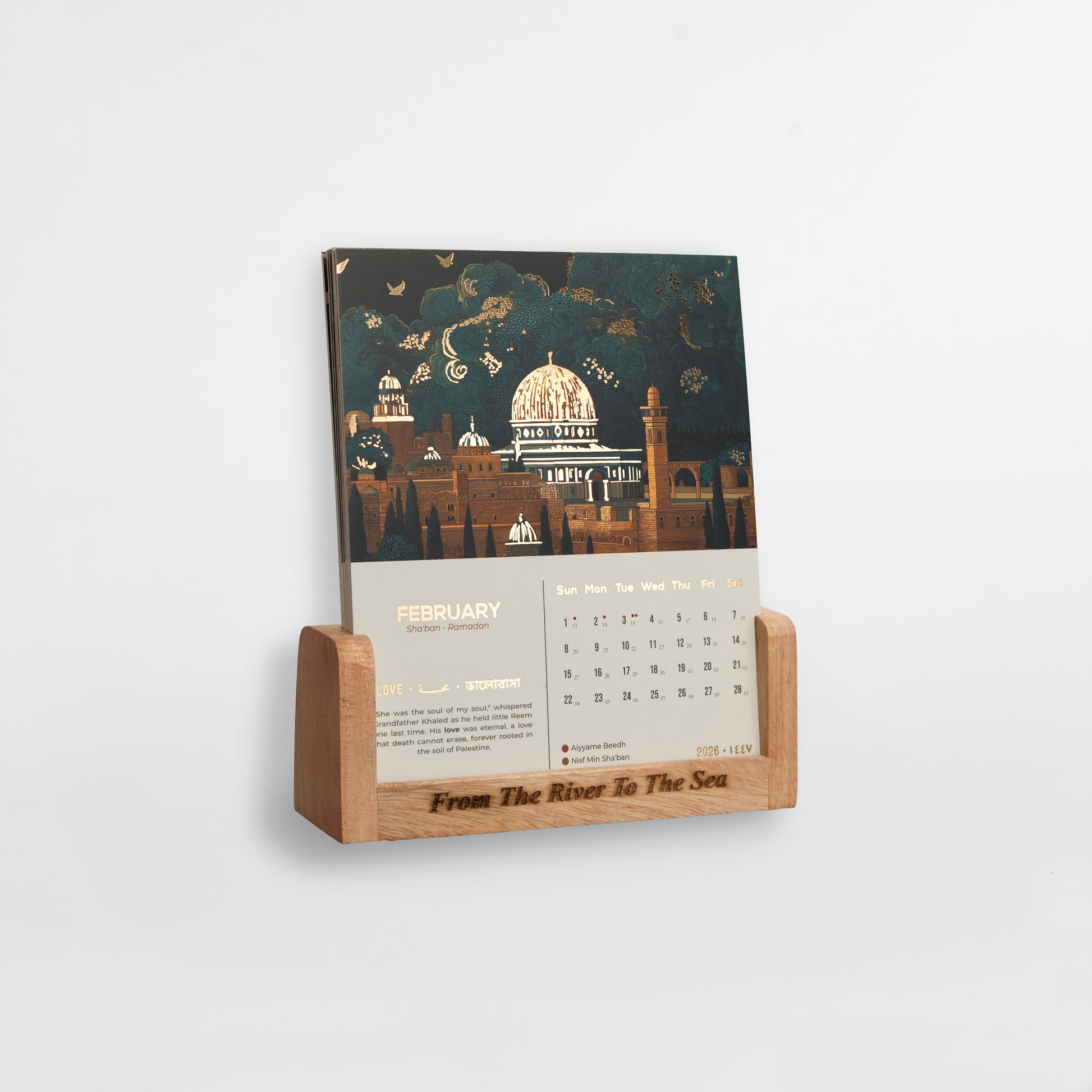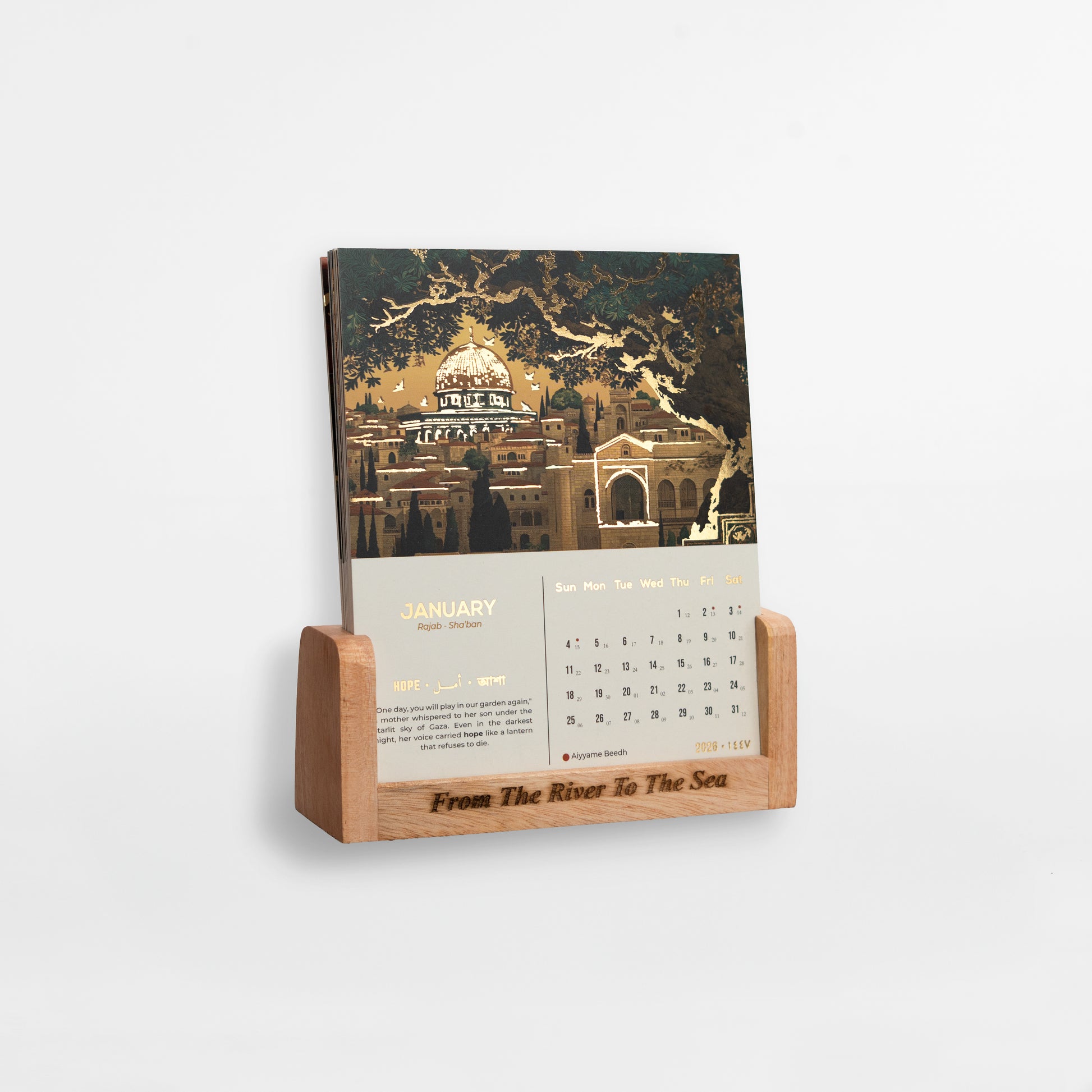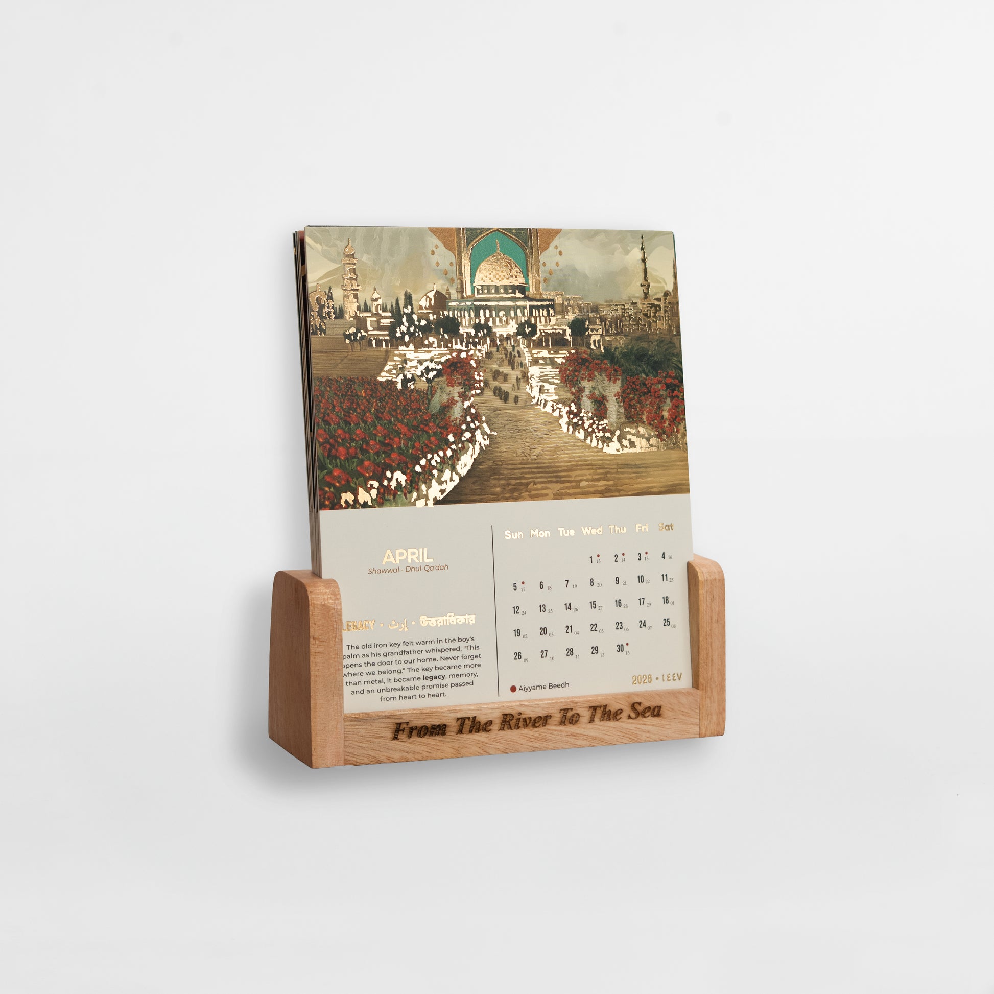 Each calendar set includes twelve gold-foiled art cards, with historical context and English–Hijri calendar dates printed directly on the cards. These are designed for month-by-month rotation on a premium wooden stand, allowing the calendar to remain both visually present and meaningfully reflective throughout the year.