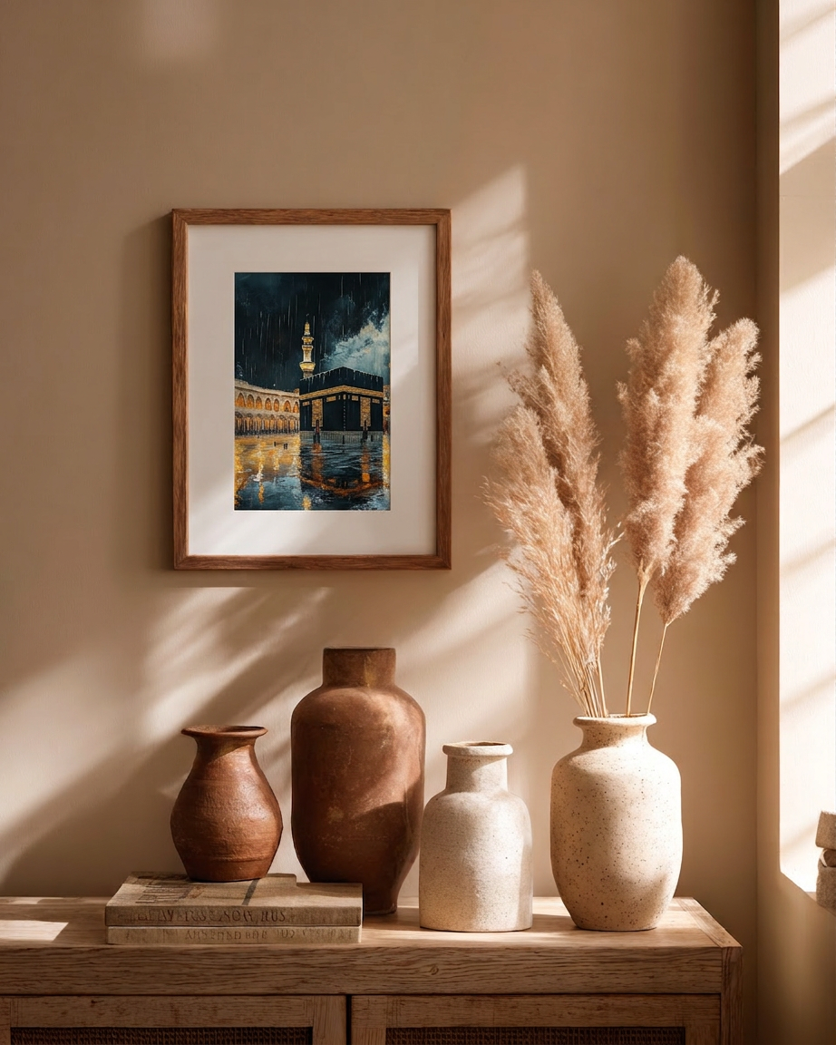 Tawaf Under Mercy depicts the Ka'bah in a rainstorm at night —